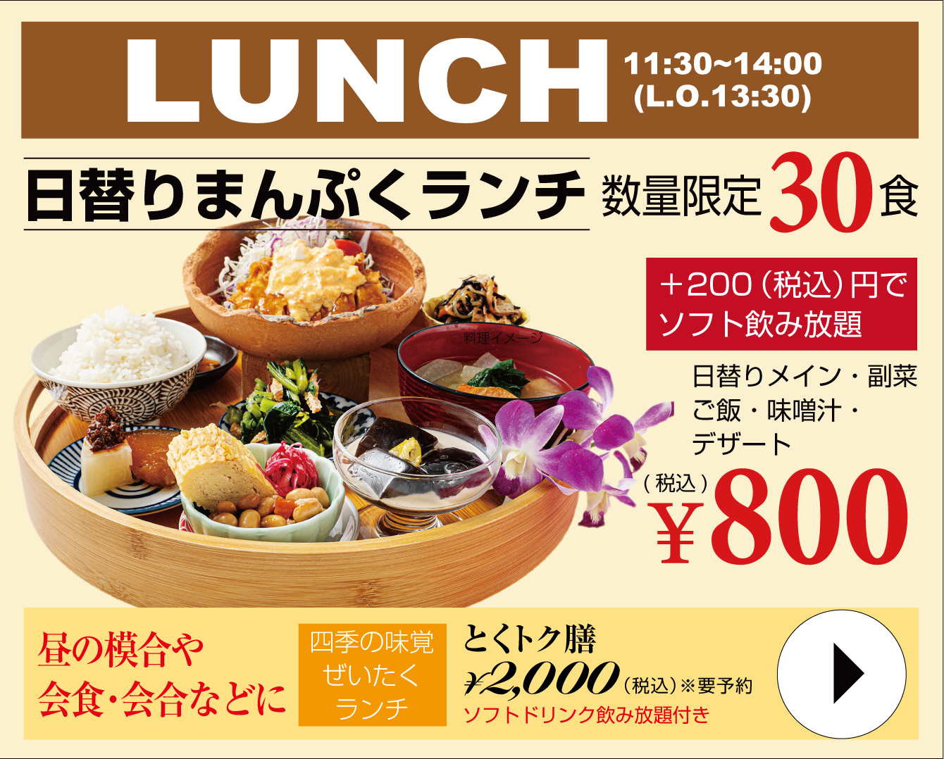 当店のお料理は、メインディッシュが選べることが特徴です!京スタイルの小鉢料理を華やかに盛り付けた「一の膳」と、焼肉やしゃぶしゃぶなどの「メイン」を2部に分けてご提供します。心もお腹も満たされる至福のひと時を、ごゆっくりとお過ごしください。