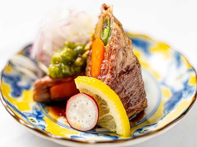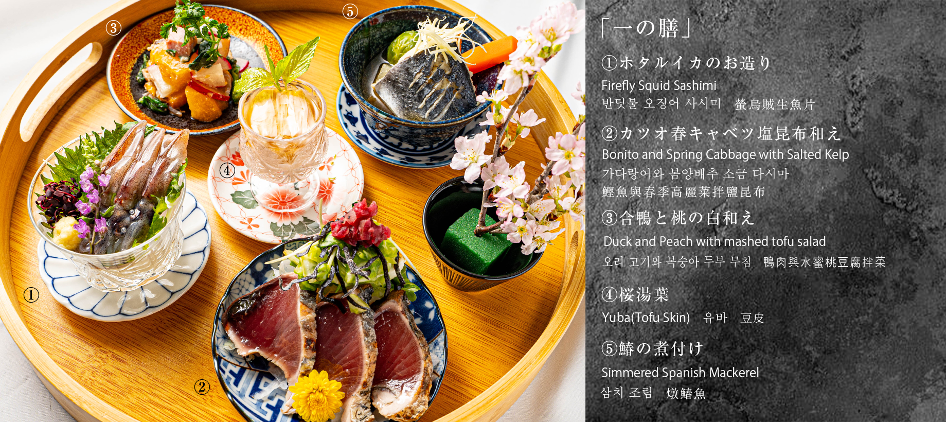 The "Ichi no zen" and "Ni no zen" are served in a Kyoto style, with appetizers filled with colorful seasonal vegetables, fish dishes using fresh seasonal fish, and meat dishes as the main course, each of which is a delicious dish that establishes itself as an a la carte dish. The menu will be served in two parts, "Ichi no zen" and "Ni no zen".