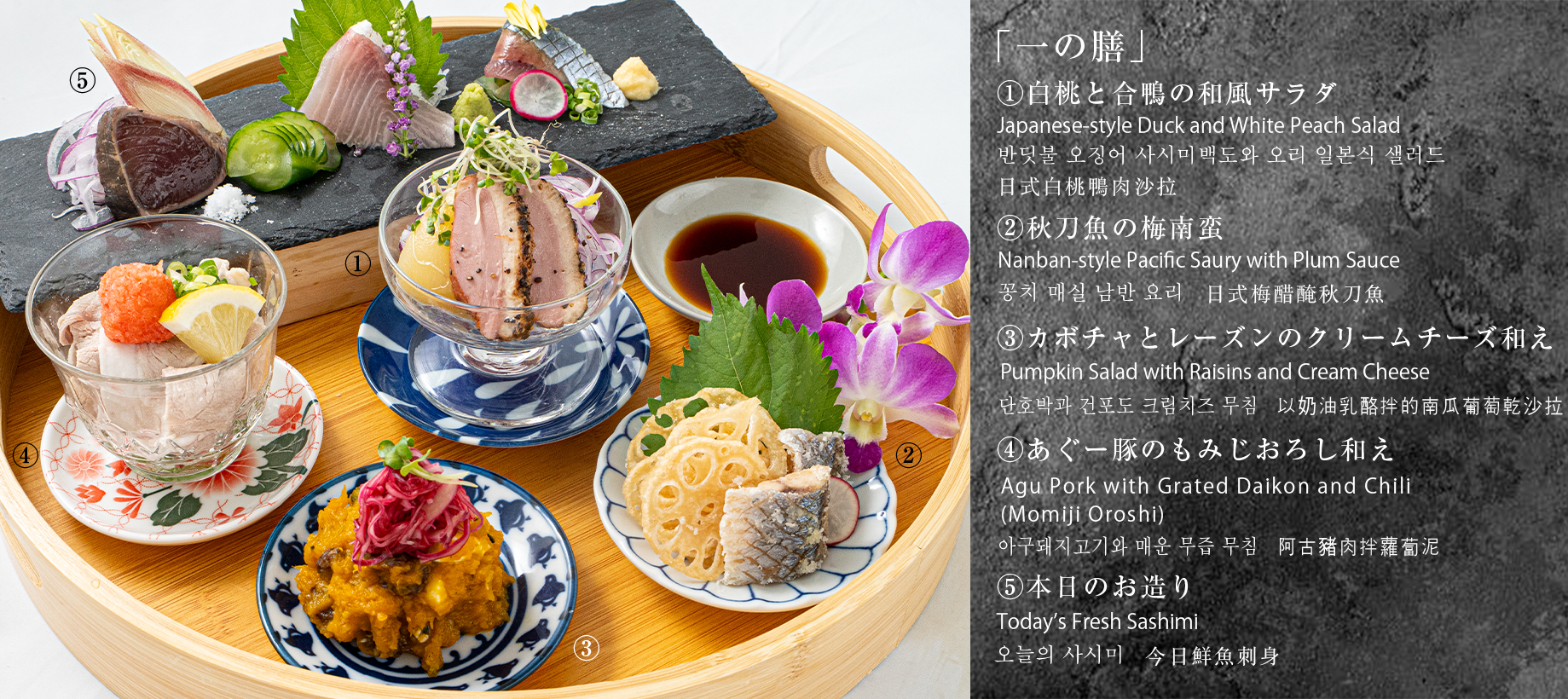 一の膳(旬食材をふんだんに盛り込んだ月替わりの小鉢料理)に加え、「焼肉コース」